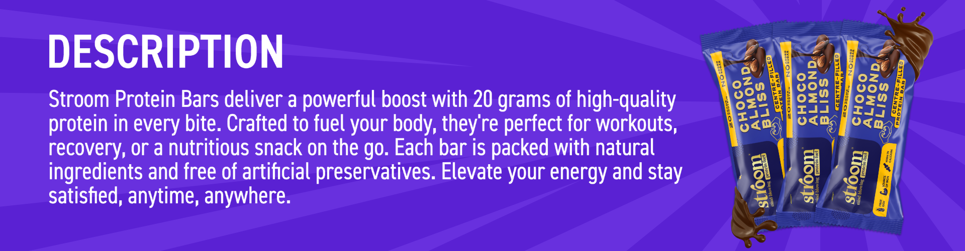Stroom bars are made to provide you with sustained energy for a period of two to three hours and can be eaten at any time throughout the day. It also works great as a quick snack for any hunger cravings one might have.